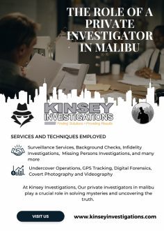 Kinsey Investigations offers discreet and dependable services as a private investigator in Malibu. For every investigative need, our skilled team provides individualized solutions. Whether it concerns missing people, cheating spouses or background checks, you can rely on us to find the truth. Get in touch with Kinsey Investigations right now for discreet, dependable and professional services in Malibu.