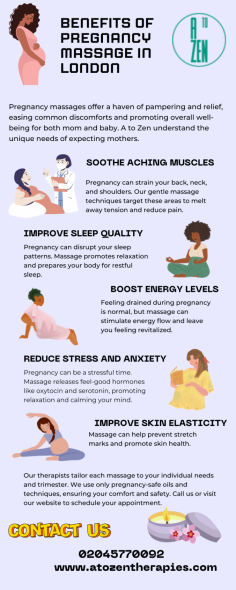 Elevate your journey to motherhood by unwinding with our luxurious pregnancy massages in London. A to Zen Therapies invites you to experience a bespoke session designed specifically for expectant mothers. Our tranquil environment and expert therapists provide a haven where you can escape the demands of daily life and embrace the serenity of a tailored massage experience, dedicated to enhancing your comfort and relaxation.