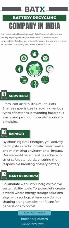 Join the green revolution with BATX Energies, the forefront battery recycling company in India. We redefine sustainability by providing cutting-edge solutions for recycling all types of batteries. From conventional to EV batteries, our state-of-the-art recycling processes adhere to the highest environmental standards. We are committed to minimizing the ecological footprint of battery waste, offering a seamless and eco-friendly approach to recycling. Choose us to be a part of the change – where responsible recycling meets a greener tomorrow. Visit our website https://batxenergies.com/ now!