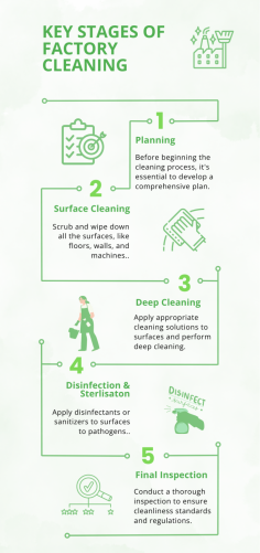 Factory cleaning involves several key stages to ensure cleanliness, hygiene, and safety standards are met. Firstly, preparation involves assessing the area, identifying hazards, and implementing safety protocols. Then, the initial stage of factory cleaning focuses on removing debris, dust, and loose contaminants. Next, thorough cleaning targets machinery, equipment, and surfaces using appropriate detergents and tools. Sanitization follows, targeting high-touch areas to eliminate bacteria and viruses. Inspection is crucial, ensuring no spots are missed and standards are upheld. Finally, ongoing maintenance and regular inspections maintain cleanliness standards, preventing buildup and ensuring a safe working environment for employees while enhancing productivity and product quality.
