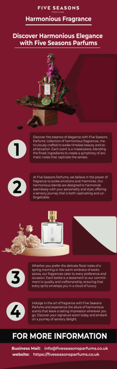 Experience the essence of tranquility with Five Seasons Parfums' latest creation. Our harmonious fragrance is meticulously crafted to bring you a sense of calm and balance. With its enchanting blend of floral and woody notes, this scent is perfect for those seeking relaxation and inner peace. Let the soothing aroma envelop you and elevate your everyday moments. Discover the blissful experience of our harmonious fragrance today.