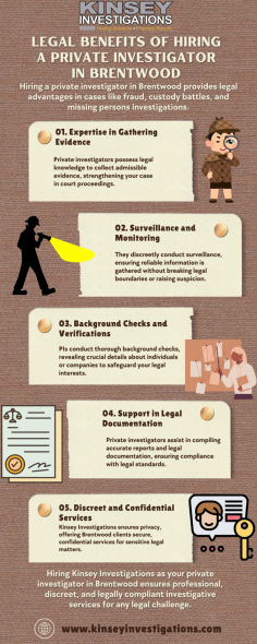 If you are facing a child custody battle, Kinsey Investigations can help as your dedicated private investigator in Brentwood. Our skilled team gathers critical evidence to support your case, ensuring your child's safety and well-being. We conduct discreet surveillance and document findings, providing you with the information necessary to make informed decisions during this challenging time.