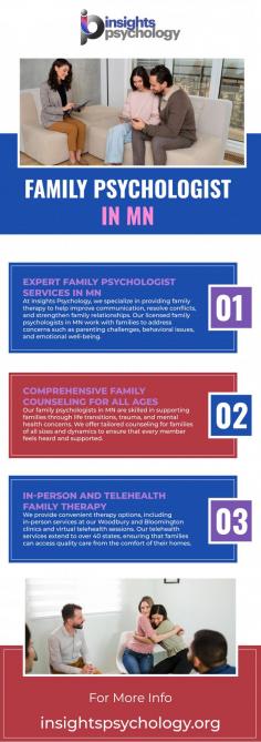 At Insights Psychology, we understand the complexities of family dynamics. Our family therapists work with families of all shapes and sizes to resolve conflicts, enhance communication, and foster healthy relationships. Available both in person and through telehealth, our family psychologist in MN is here to help your family thrive. Connect with us today to improve family wellness and harmony with expert guidance.