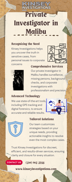 Discover unrivaled investigative solutions in Malibu with Kinsey Investigations. Our skilled private investigators in Malibu provide discreet and reliable services for all your needs. Trust Kinsey Investigations for comprehensive, efficient, and trustworthy investigative solutions