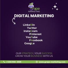 Discover expert digital marketing services at Grape Marketing. We specialize in social media management, including LinkedIn, Twitter, Instagram, Pinterest, YouTube, Facebook, and Google. Our strategic approach to marketing ensures the growth of your business with tailored campaigns. Whether you need to increase your social media presence or enhance online visibility, Grape Marketing is your trusted partner. Contact us today at +1 646 846 2528 or visit our website at www.grape-marketing.com for personalized digital marketing solutions. Grow your business with proven strategies and innovative techniques!
