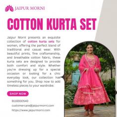 Jaipur Morni presents an exquisite collection of cotton kurta sets for women, offering the perfect blend of traditional and casual wear. With beautiful prints, fine craftsmanship, and breathable cotton fabric, these kurta sets are designed to provide both comfort and style. Whether you're dressing up for a special occasion or looking for a chic everyday look, our collection has something for you. Shop now to add timeless pieces to your wardrobe.