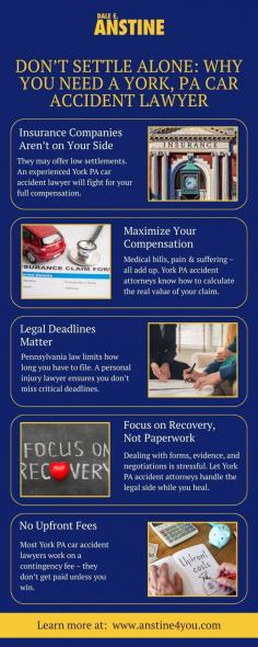 After a car crash, having the right legal team on your side is critical. This infographic shows how the experienced attorneys at Dale E. Anstine—a leading team of York, PA car accident lawyers—advocate for your best interests every step of the way. Learn why thousands in Pennsylvania trust local attorneys to handle their personal injury claims effectively and professionally.