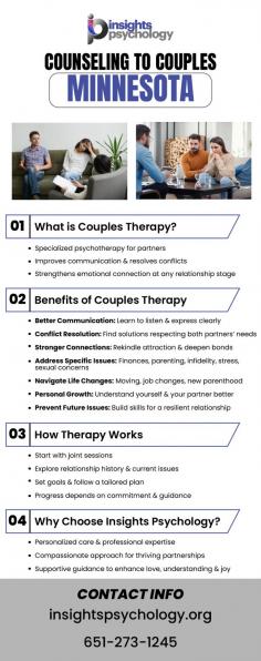 Every relationship faces challenges, but the right professional guidance can help couples reconnect and move forward together. Insights Psychology offers counseling to couples Minnesota with a compassionate and personalized approach designed to support healthier communication and stronger emotional bonds. Our skilled therapists work closely with couples to address trust issues, recurring conflict, stress, and relationship transitions in a safe and understanding environment. We provide in-person sessions at our Woodbury and Bloomington clinics, along with convenient telehealth options across PSYPACT states. For trusted counseling to couples Minnesota, Insights Psychology is committed to helping partners build clarity, confidence, and lasting relationship success. For more info visit here: https://insightspsychology.org/couples-therapy-in-mn/