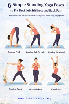 Simple yoga standing exercises can facilitate the relief of stiffness caused by working at a desk through improved posture, spinal flexibility, and increased blood flow. The use of light stretching movements and mindful exercise relieves pain from the lower back and shoulder tension.